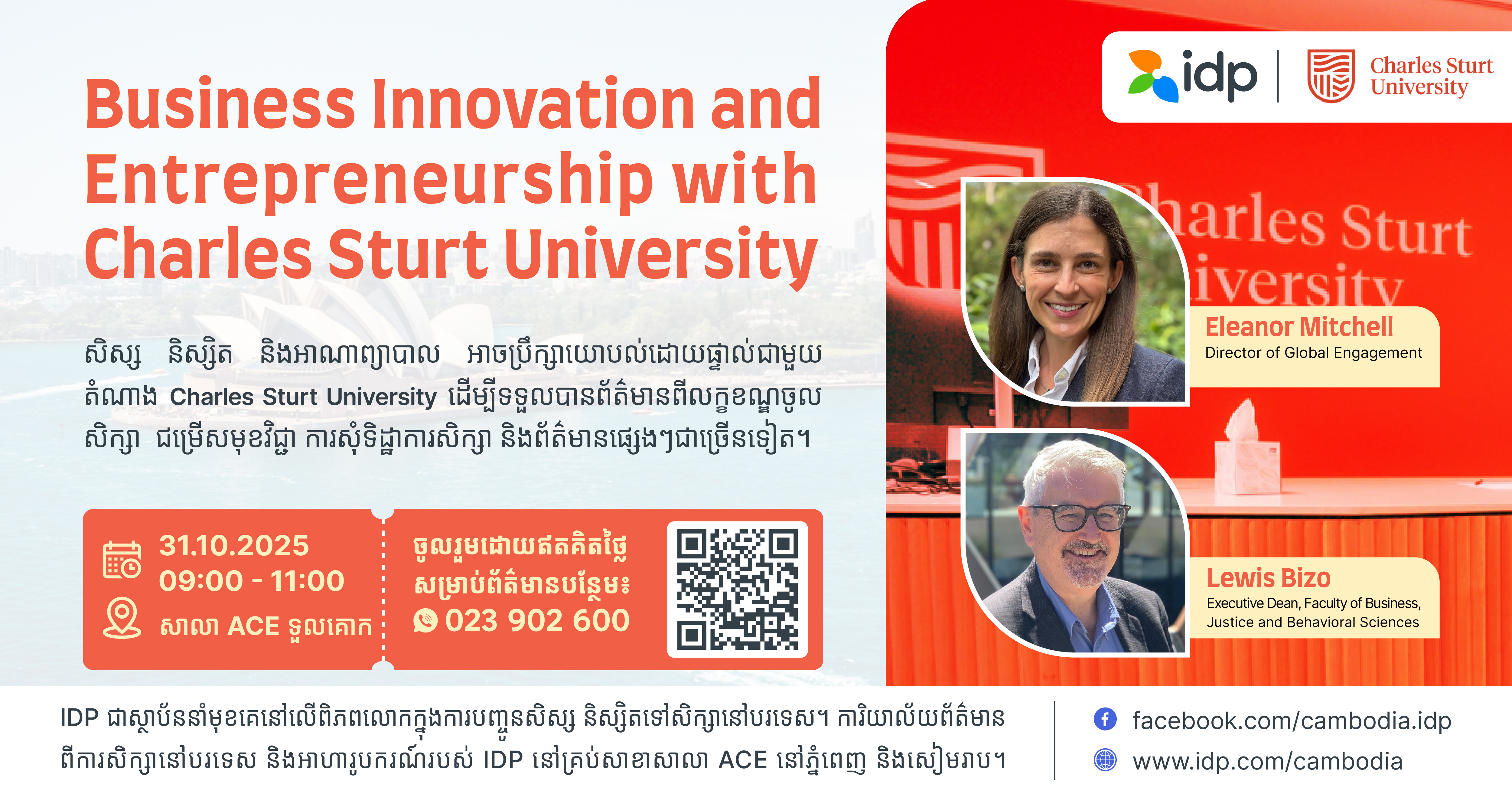 ជួបជាមួយតំណាងសាលាមកពី Charles Sturt University ដើម្បីទទួលបានព័ត៌មានសំខាន់ៗដូចជា របៀបដាក់ពាក្យចូលរៀន អាហារូបករណ៍ លក្ខខណ្ឌចូលរៀន ជម្រើសសិក្សា និងការសុំទិដ្ឋាការជាដើម។