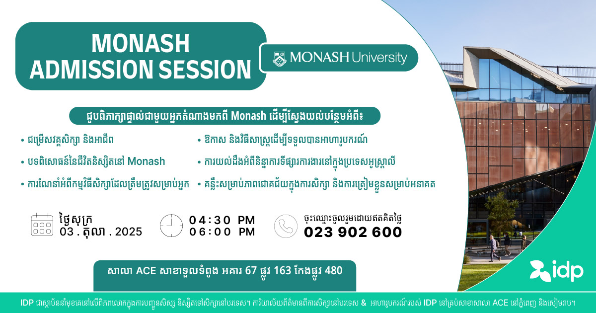 ជួបជាមួយតំណាងសាលាមកពី Monash University ប្រទេសអូស្ត្រាលី ដើម្បីទទួលបានព័ត៌មានសំខាន់ៗដូចជា របៀបដាក់ពាក្យចូលរៀន អាហារូបករណ៍ លក្ខខណ្ឌចូលរៀន ជម្រើសសិក្សា និងការសុំទិដ្ឋាការជាដើម។